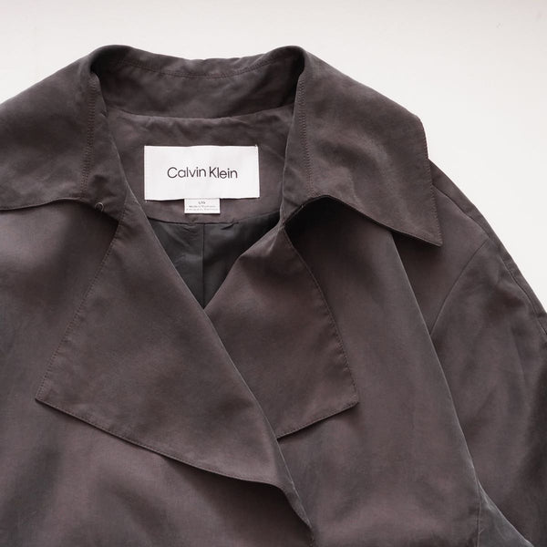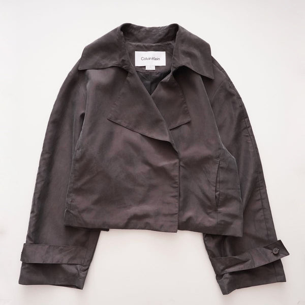 《商品説明》ブラウンのような、ボルドーのような、角度によってはグリーンが入っているようにも見えるカラーのショートトレンチです。