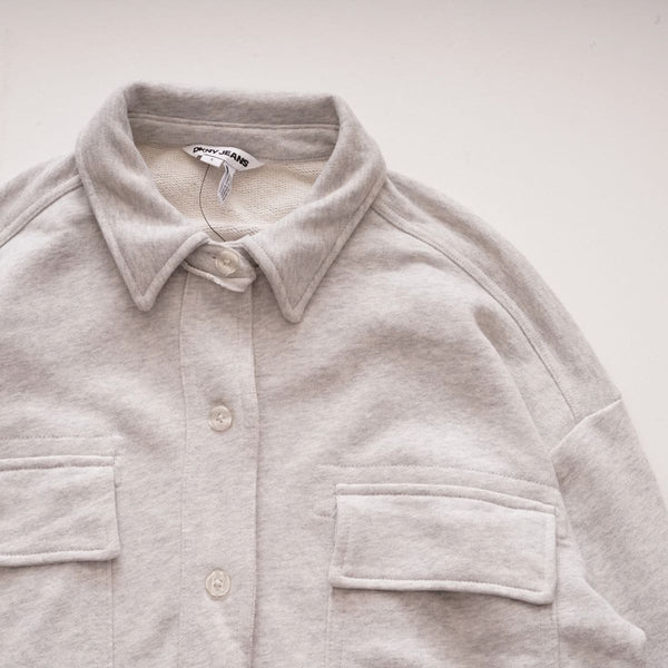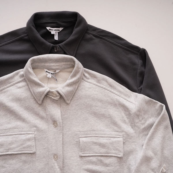 《商品説明》スウェット素材を使用したシャツジャケット。大きな胸ポケットやカットオフデザインなどこだわりデザインが魅力。さまざまな使い方ができる万能アイテムです。